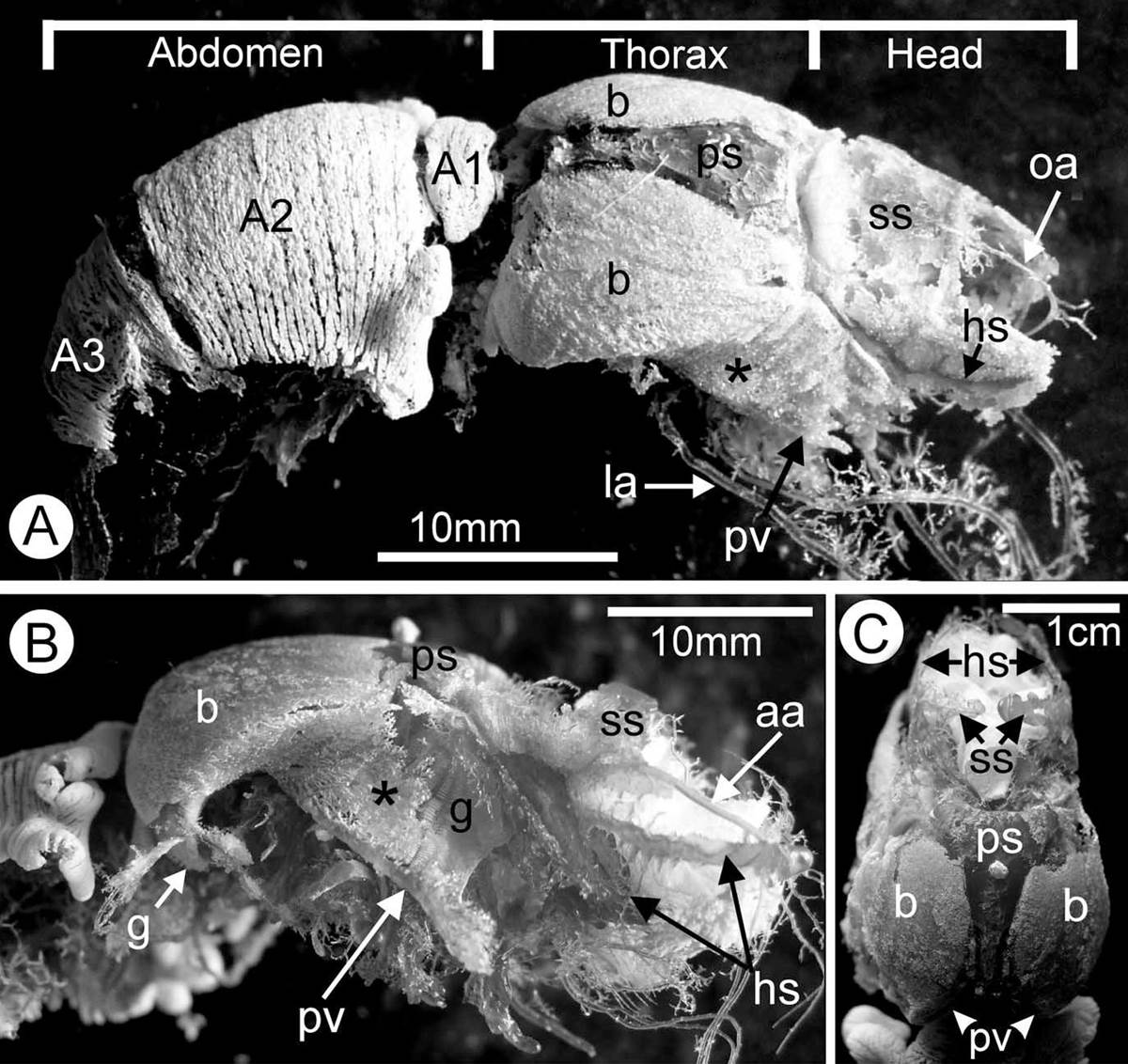 由于不再使用寄生外殼,更多地采用它們的螯足進行活動,加之胸腔和胸部的硬化。