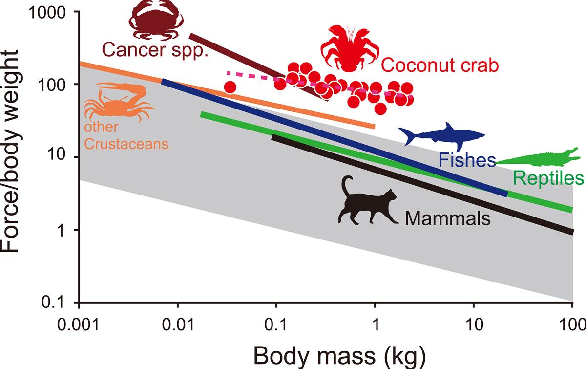 在相關的研究中,科學家也沒有發現椰子蟹握力與性別二態化的差異,也就是說,不管公母,握力幾乎都是同等比例的。