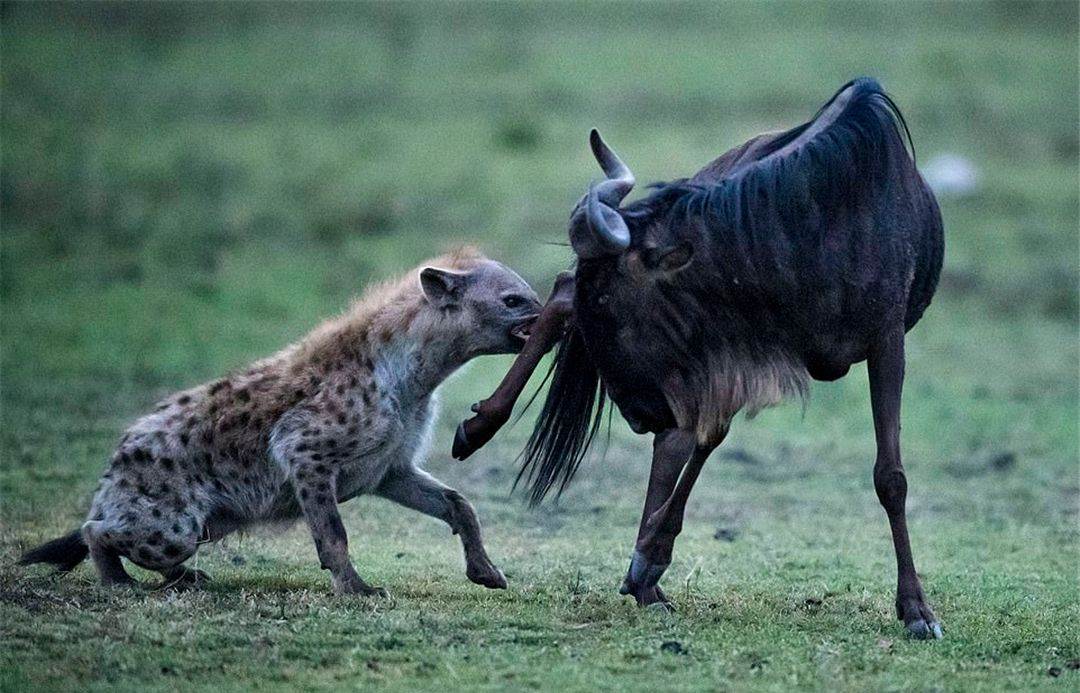 其次是食草動物的頭部一般有角,成年個體會用角做武器,如果從正面進攻,斑鬣狗有可能會被堅硬的角所傷,所以斑鬣狗一般會避開食草動物的正面,而是從臀部著手,臀部沒有眼睛,可以大大躲避食草動物的反擊。