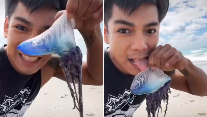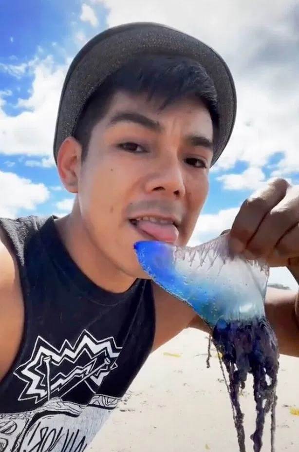 之後他把視訊發在了TikTok上,這下立刻炸開了鍋,原來這傢伙舔的竟然是世界上最毒的水母之一——葡萄牙戰艦,又叫僧帽水母。