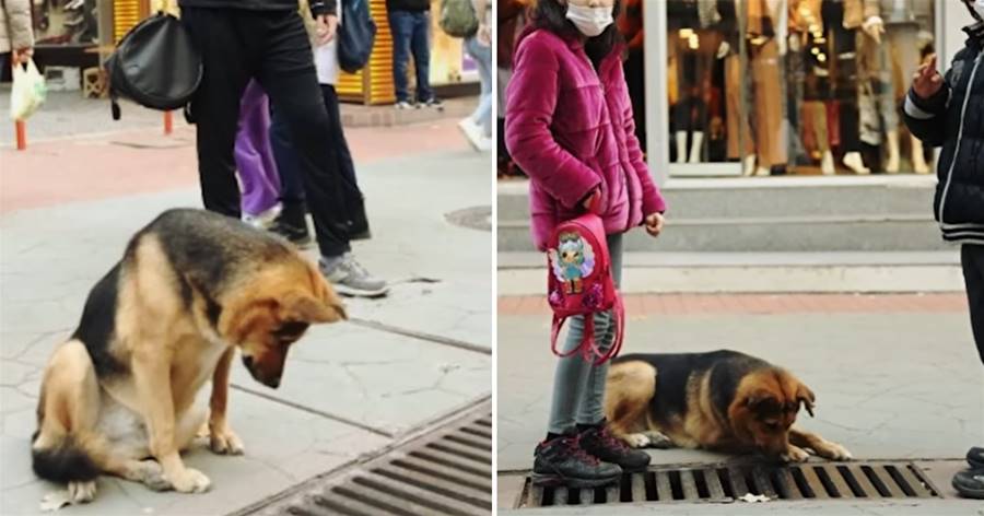 跟了一路,最後來到了一條繁華的街道,狗狗在一個下水道邊坐下了。