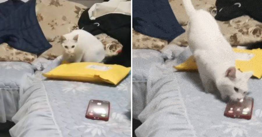 看著女主人半天也沒接電話,一旁的貓咪倒是心急了,連忙跑去接通了電話,示意女子趕緊來接。