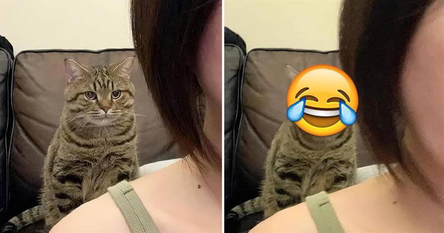 網友閑來無事正端坐在沙發前,想來幾張自拍,但在最后倒數1秒時,自家貓主子竟然亂入鏡頭!