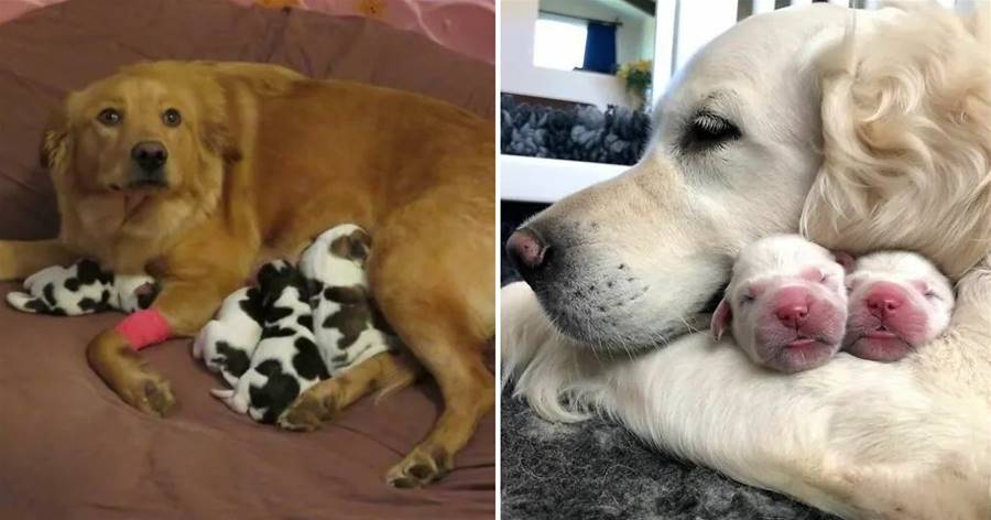 「剛領養了一只混血大金毛,它就生下了一窩小奶牛,感覺狗媽有點懵......」