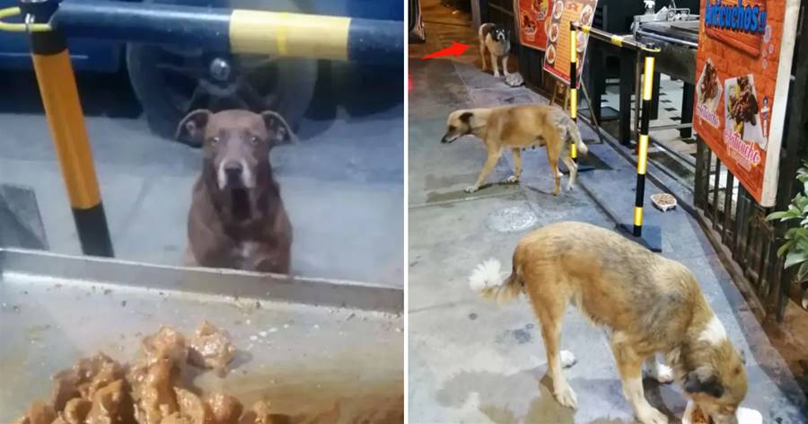 店老闆考慮到自己平時要忙,于是就在門口給毛孩子們準備了狗糧,這樣哪怕自己打烊了,它們都能吃到東西。