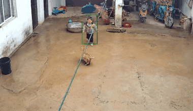 見狗狗也無能為力,孩子又跑回了門旁邊,狗狗陪伴著孩子顛顛地跟在了他的后面……