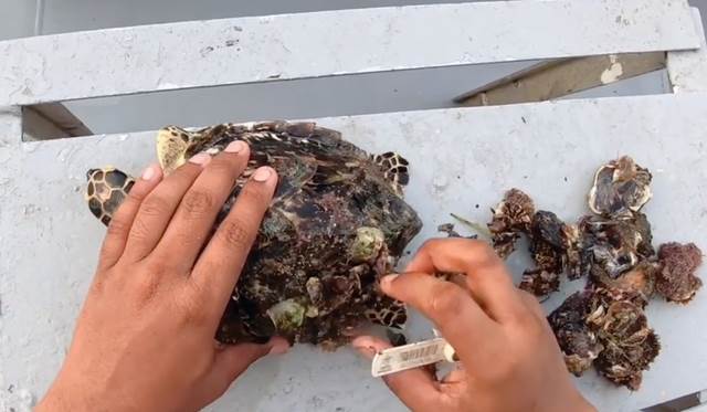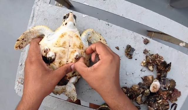雖然小海龜有點掙扎,但是為了它的身體著想不得不一次性把這些藤壺給清除。把它背面的藤壺清理干凈之后男子在它的肚子上又發現了幾個,顯然這邊的更難清理也更痛,使得小海龜四肢不停的滑動,看起來搞笑又心酸。經過男子十多分鐘的努力,小海龜身上的藤壺總算全都被清除了。