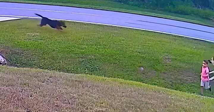 早前,美國一小男孩和自家的狗狗在草坪上玩耍時,突然從遠處跑來一只大黑狗想要襲擊小男孩。大黃狗見狀立即上前護住小主人,英勇撲向大黑狗,并成功將其趕走。這一幕剛好被家里的監控記錄了下來。