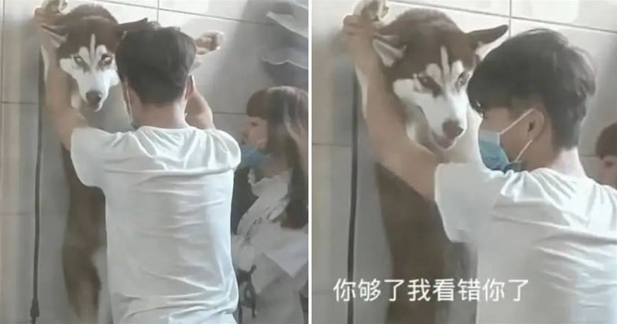 二哈在洗澡完之后,被美容師按在墻上,然后另一個女孩子在那里不停的幫吹毛發,而二哈看起來模樣好可憐似的,還看到自己的主人在拍照,讓主人趕緊過去救它。
