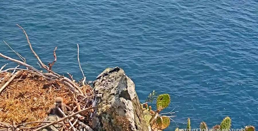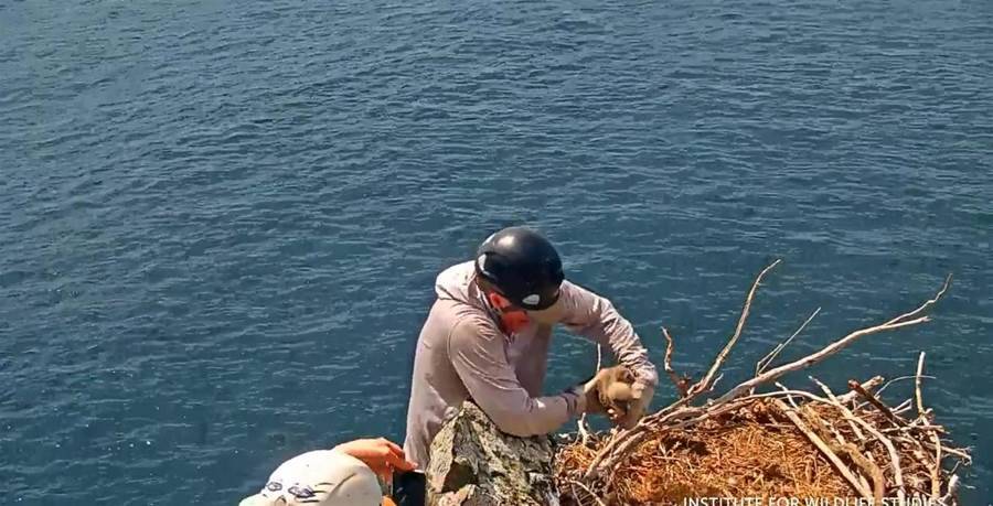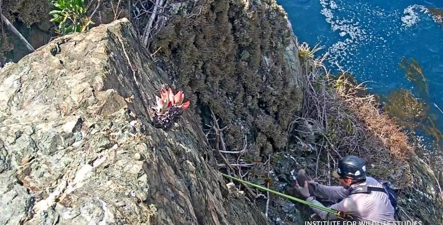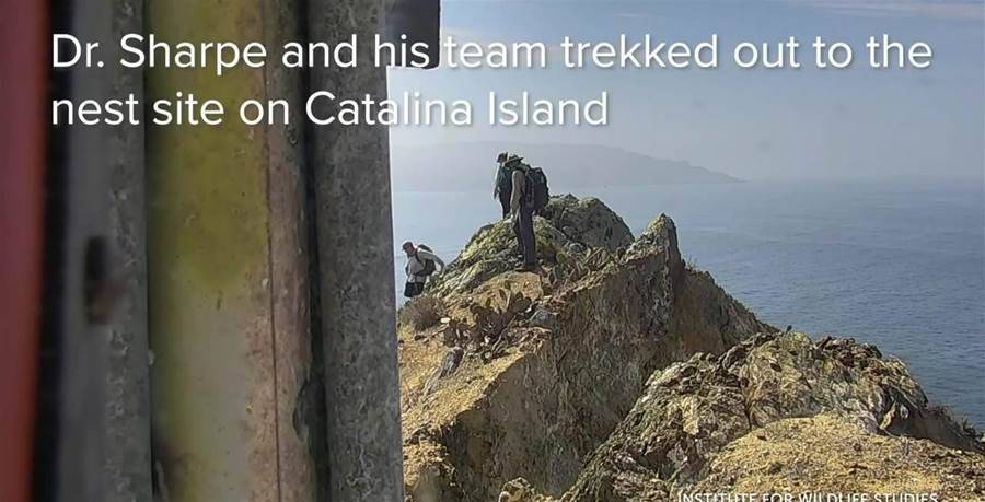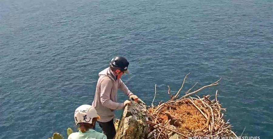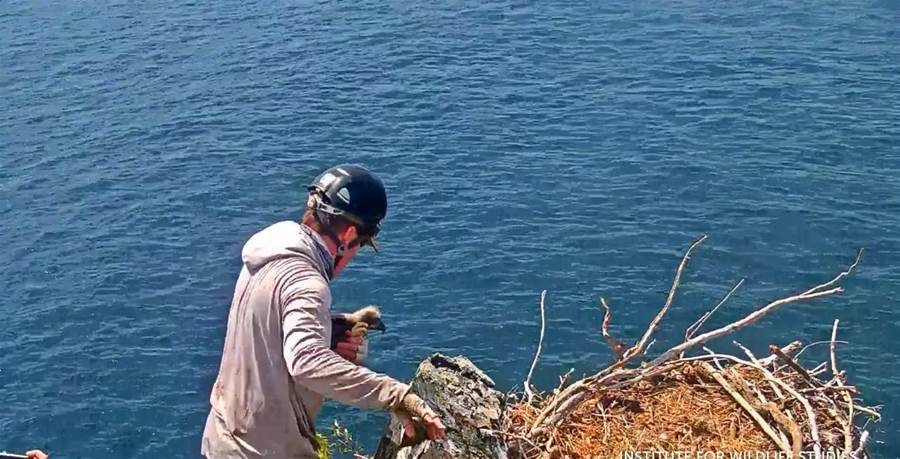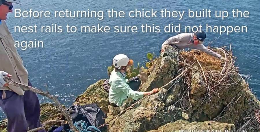 幸好專門研究追蹤加州海峽群島白頭海鵰並協助復育的生態學家夏普(Peter Sharpe),與其研究團隊從野外監控攝影畫面注意到這個情況,于是隔日一早連忙跋涉抵達該懸崖協助救援。